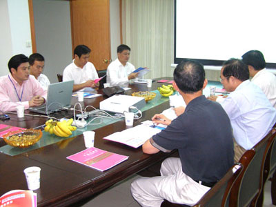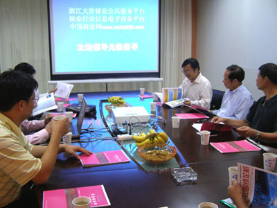 浙江省信息产业厅党组书记曾浩明(右六)一行听取中国袜业网 CEO魏晓明(右二)对袜业行业电子商务平台的相关介绍